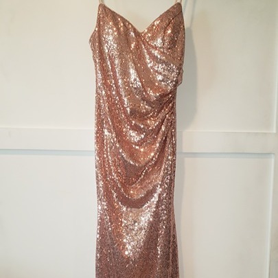 Ever Pretty Full Length Rose Gold Sequin gown. This formal gown is fully lined and has back sipper entry. Size Large. Measurements in inches: Chest - 16w (32 total), Waist - 14w (28 total), Dress length - 52 long, Adjustable strap length - 18 inches total.